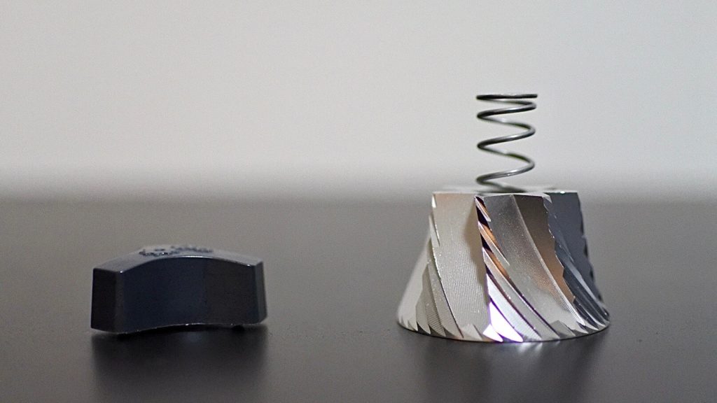 この硬くて摩耗しにくい刃を使用することによって、コーヒー豆を挽いた時に、砕かれた豆の欠片の一つ一つが均質となり、微粉と呼ばれるコーヒーの味を悪くする雑味が出ないようにできるので、とても美味しいコーヒーが飲めるということです。