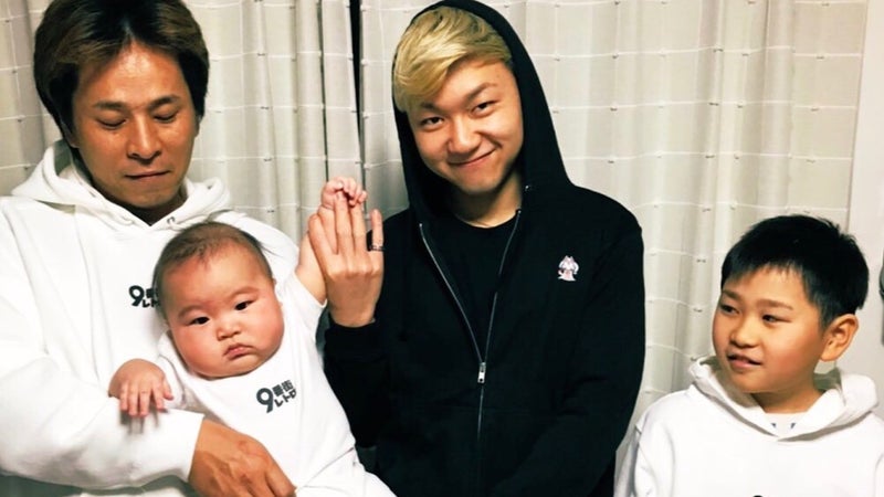 こちらの写真は、京極さんが、オリジナルアイテムを作るサイト「SUZURI」で販売している「9番街レトロ」のパーカーや赤ちゃんの洋服を家族で来ている写真です。
