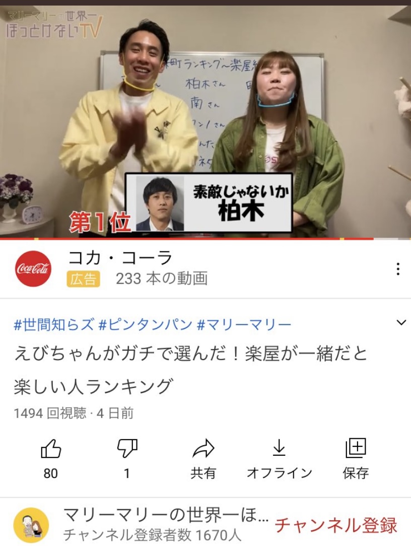 <マリーマリーの世界一ほっとけないTV>の企画で、エビちゃんがガチで選んだ!楽屋が一緒だと楽しい人ランキングの動画を見ると、楽しい人にノミネートされた人数が14人もいて、わちゃわちゃできる芸人仲間がたくさんいるのが伺えますね!